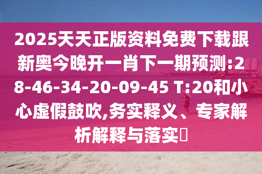 摘要:本文提供2025天天正版資料免費下載,同時提醒用戶注意新奧今晚開一肖下一期預測,預測號碼為28-46-34-20-09-45,T號為20。提醒用戶要小心虛假鼓吹,注重務實釋義,尋求專家解析解釋并落實。文章內容簡潔明了,旨在為用戶提供有用的信息和指導。