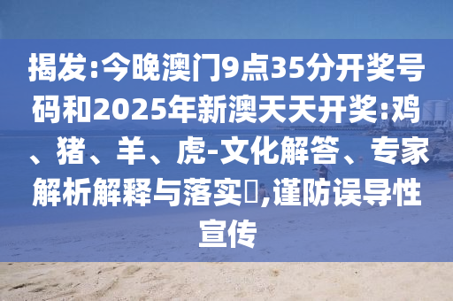 摘要:,,本文揭露了關(guān)于澳門今晚9點35分的開獎號碼以及2025年新澳天天開獎的預(yù)測信息,涉及生肖雞、豬、羊、虎。同時提醒公眾注意文化解答和專家解析解釋的真實性,避免受到誤導(dǎo)性宣傳的影響。文章旨在提醒公眾保持警惕,謹(jǐn)慎對待此類信息。